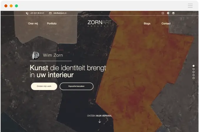 Wim Zorn is een abstract kunstenaar. Zijn website was na jaren geen onderhoud sterk verouderd en paste niet meer bij zijn doelgroep. Samen hebben wij een nieuwe website ontworpen die beter aansluit op zijn doelgroep en de kunst. Benieuwd hoe dat eruitziet?